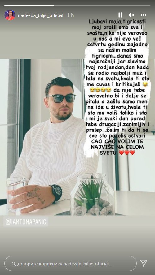Podsjetimo, on je dobio sina sa Nadeždom Biljić, takođe bivšom učesnicom, a ljubav su započeli u pomenutom rijaliti formatu.