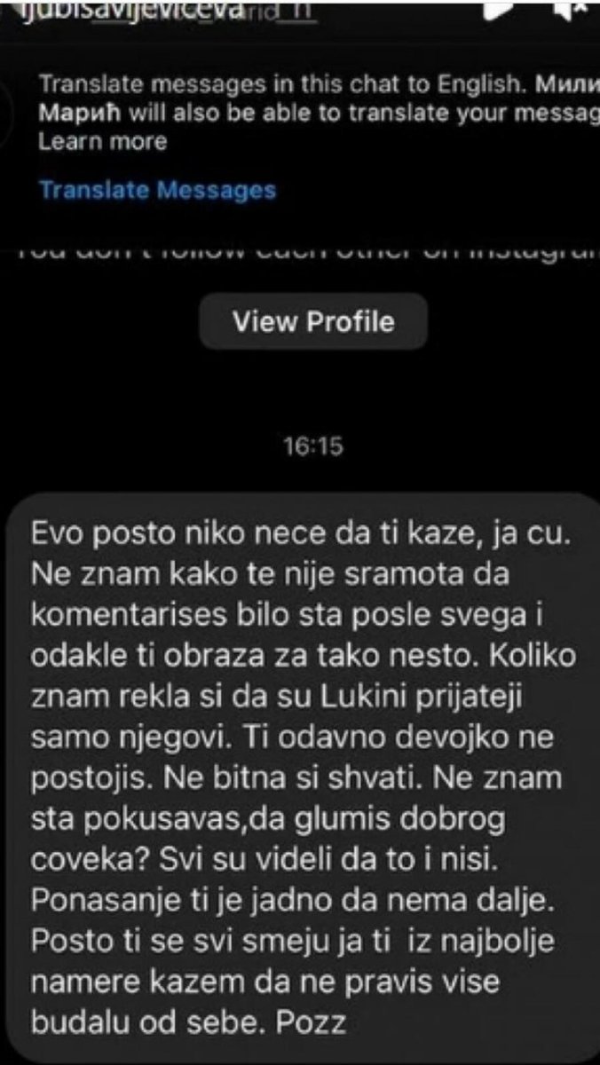 Uđeš na Instagram, tamo gdje piše "99+" poruka, a svi znamo da su tu ljudi sa kojima se ne dopisuješ i nemaš nikakvu komunikaciju. Uđem tamo danas i vidim poruku od osobe za koju sam optuživana da je proganjam, da hoću nazad, da se miješam i neke gluposti. Svi znaju da ja kad stavim tačku onda je tačka stavljena. Okej, niste vjerovali, ali sada ćete se uvjeriti na skrinšotovima. Na sve to, osoba koja se predstavlja kao master učitelj, što znači da će za koju godinu da uči našu djecu pravopisu ili tako nečemu, piše "nebitna" odvojeno. Ljudi, rečca "ne" se piše spojeno sa svim pridjevima, a odvaja se samo od glagola - dodala je Ljubisavljevićeva.