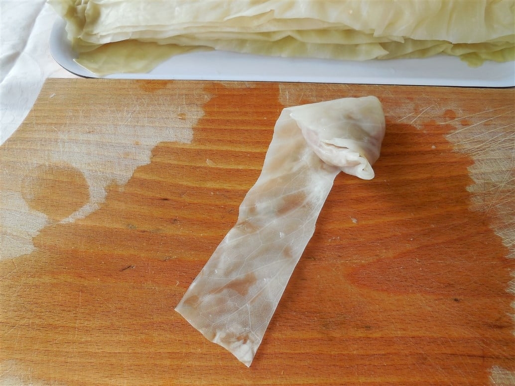 Vodite brigu o tome da ne stane puno punjenja, oko jedna kašičica ako jedan list podijelite na 3 do 4 trake - zavisi od veličine kiselog kupusa.