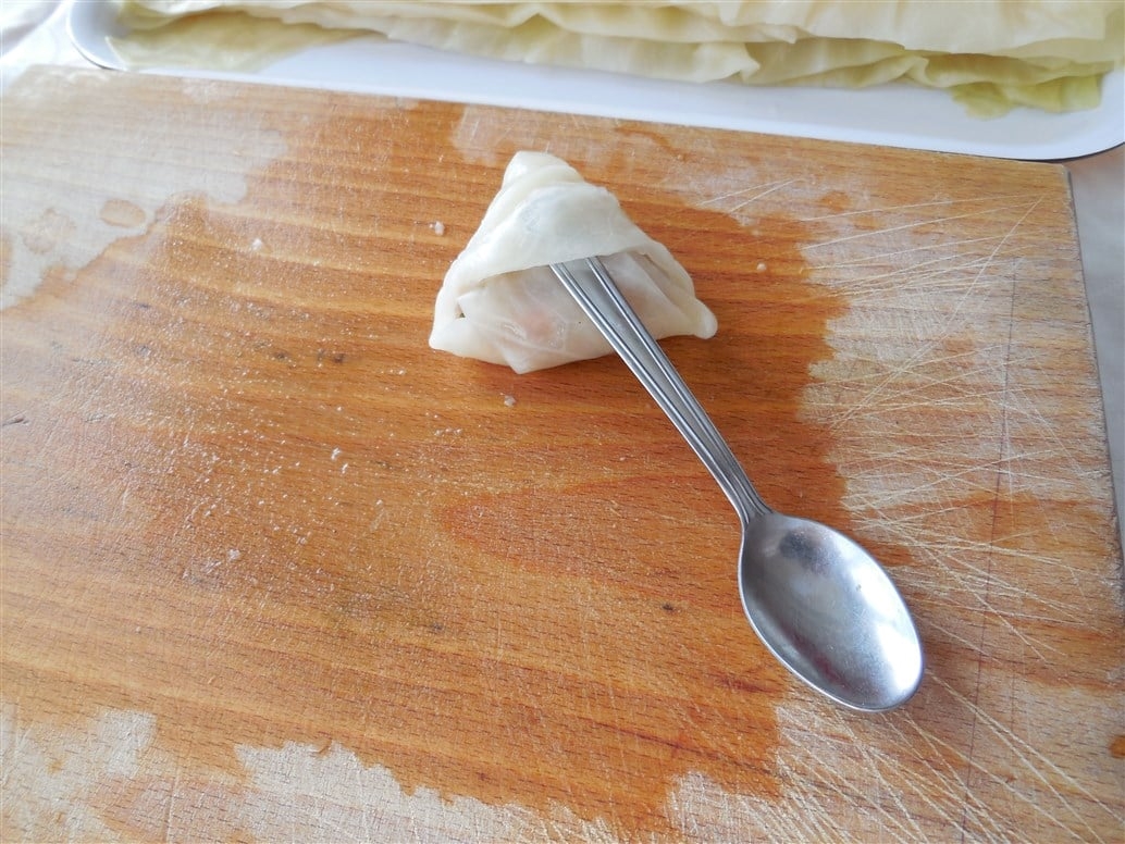 4. Zadnji dio trakice pomoću drške kašike ugurajte unutra da se sarma ne razmota